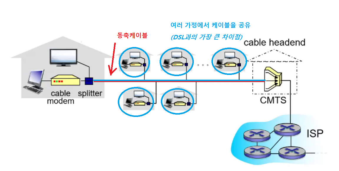 - Home Access Network: DSL(Digital SubscribeLine), Cable, FTTH(Fiber To The Home), Ethernet/WiFi
