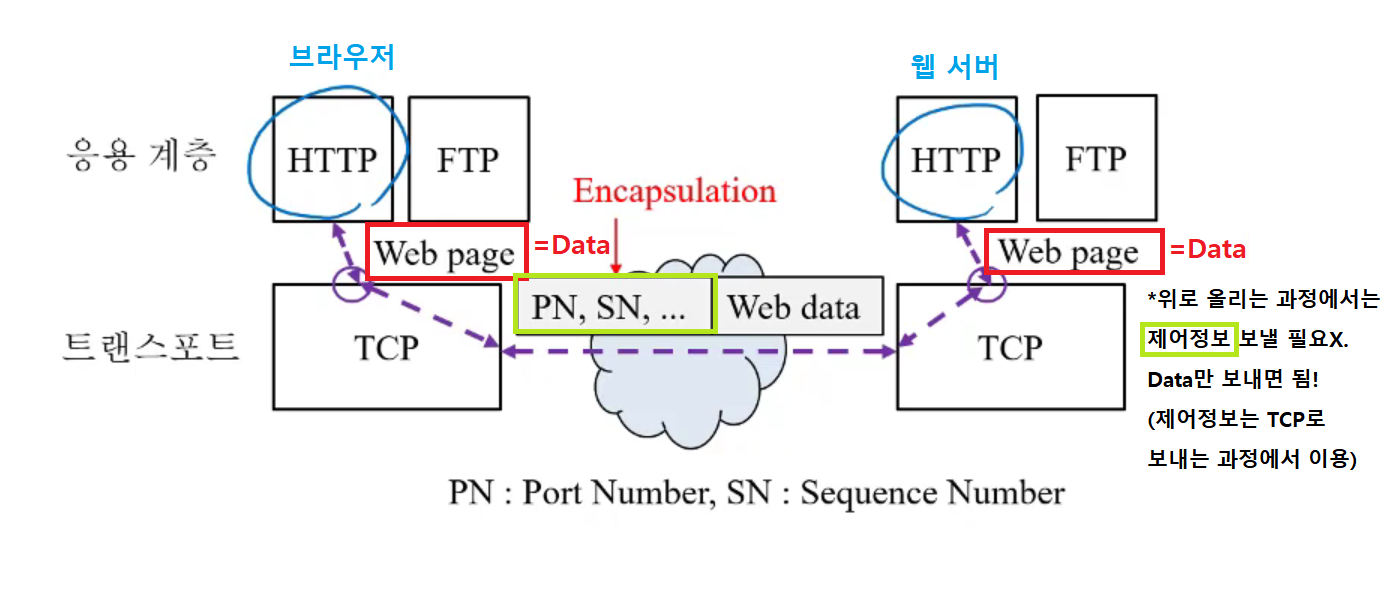 : 상위 계층에 있는 프로토콜이 하위계층을 이용하기 위해, 하위 계층의 어떠한 필요한 정보를 추가해서 하위 계층 프로토콜이 상위 계층 프로토콜을 감싸는 방식으로 교환하는 정보를 만드는 방법.