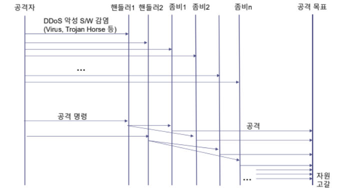 - DDoS 공격에 동원되는 컴퓨터: 좀비(zombie) 컴퓨터 또는 봇(bot) 컴퓨터